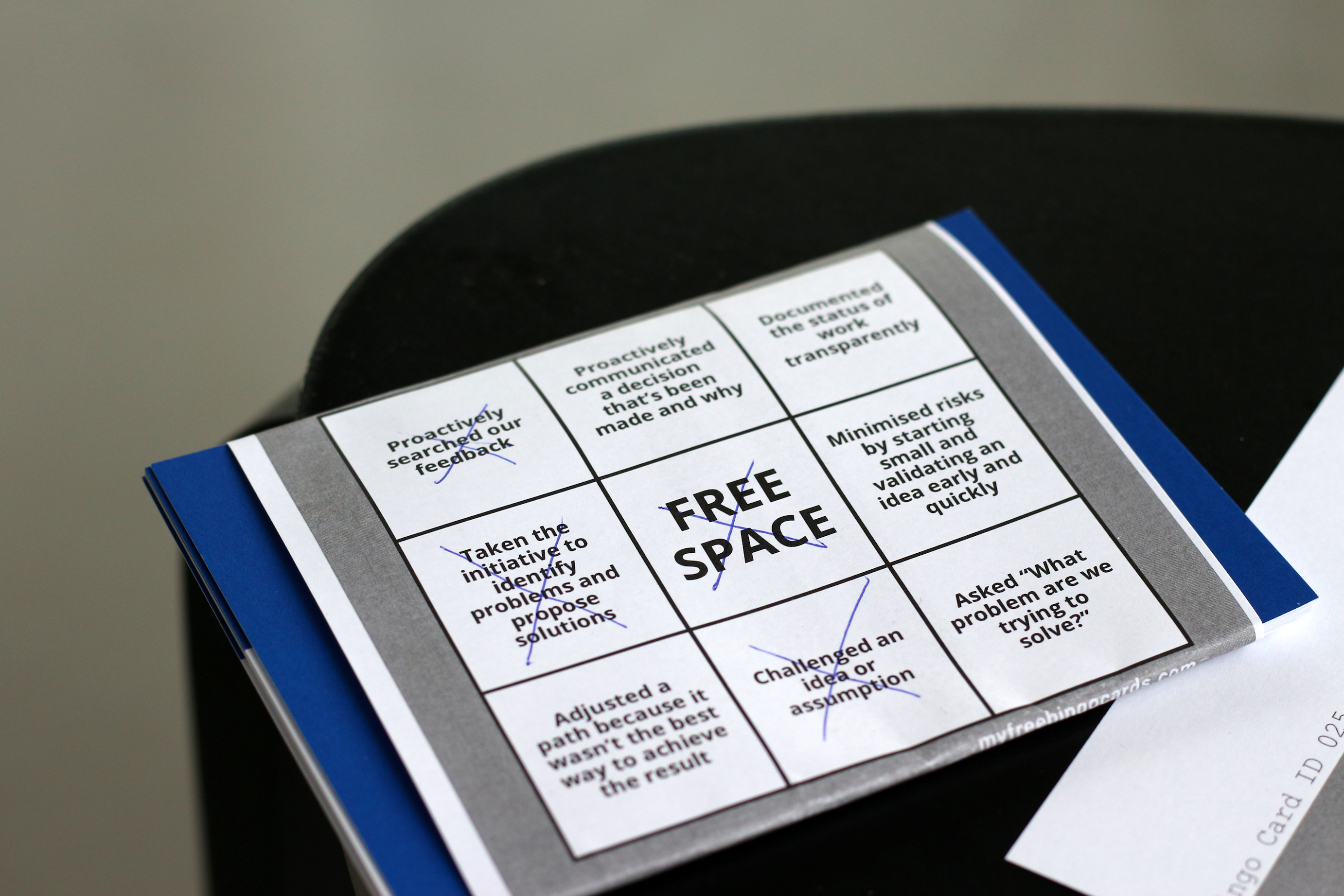 Auf einer Bingo-Karte standen konkrete Verhaltensweisen von verschiedenen Werten. Nach der Nennung einer Verhaltensweise wurden dazu passende, erlebte Situationen geteilt. Hiermit wollten wir die praktische Relevanz der Werte im Arbeitsalltag aufzeigen und über den Austausch unterschiedlicher Erlebnisse für alle Kolleg:innen greifbar machen.
